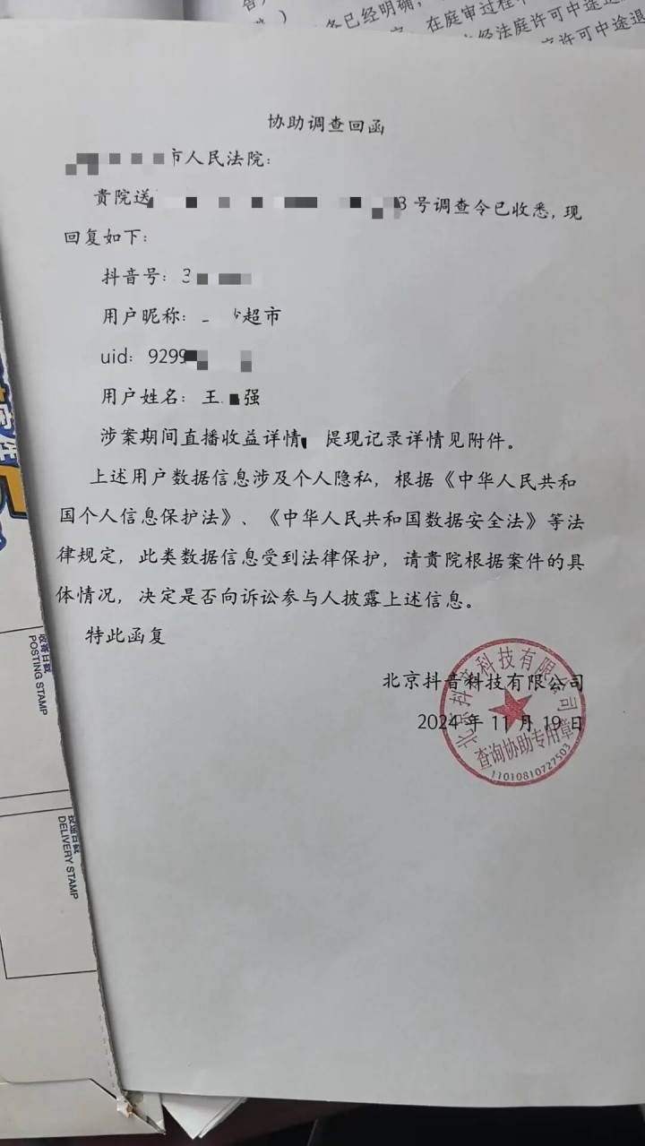 ▲北京抖音科技有限公司出具的协助调查回函