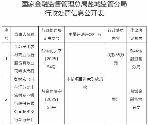 盐城金融监管分局对江苏昆山农村商业银行股份有限公司响水支行罚款35万元;对彭树宏(时任江苏昆山农村商业银行股份有限公司响水支行副行长)警告。